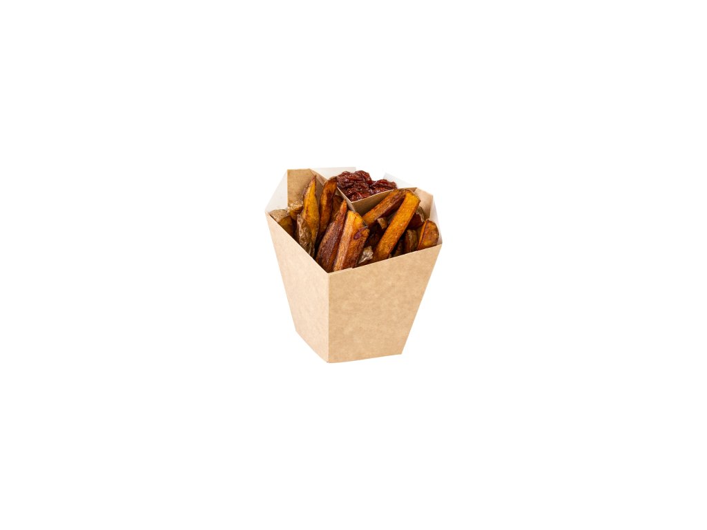 Malá papierová krabička je ideálna na servírovanie hranolčekov, ku ktorým môžete pridať dip, na ktorý je tu samostatná priehradka. Je vyrobená z pevného papiera a potiahnutá vrstvou recyklovateľného PE, ktorý neprepustí žiadnu mastnotu.